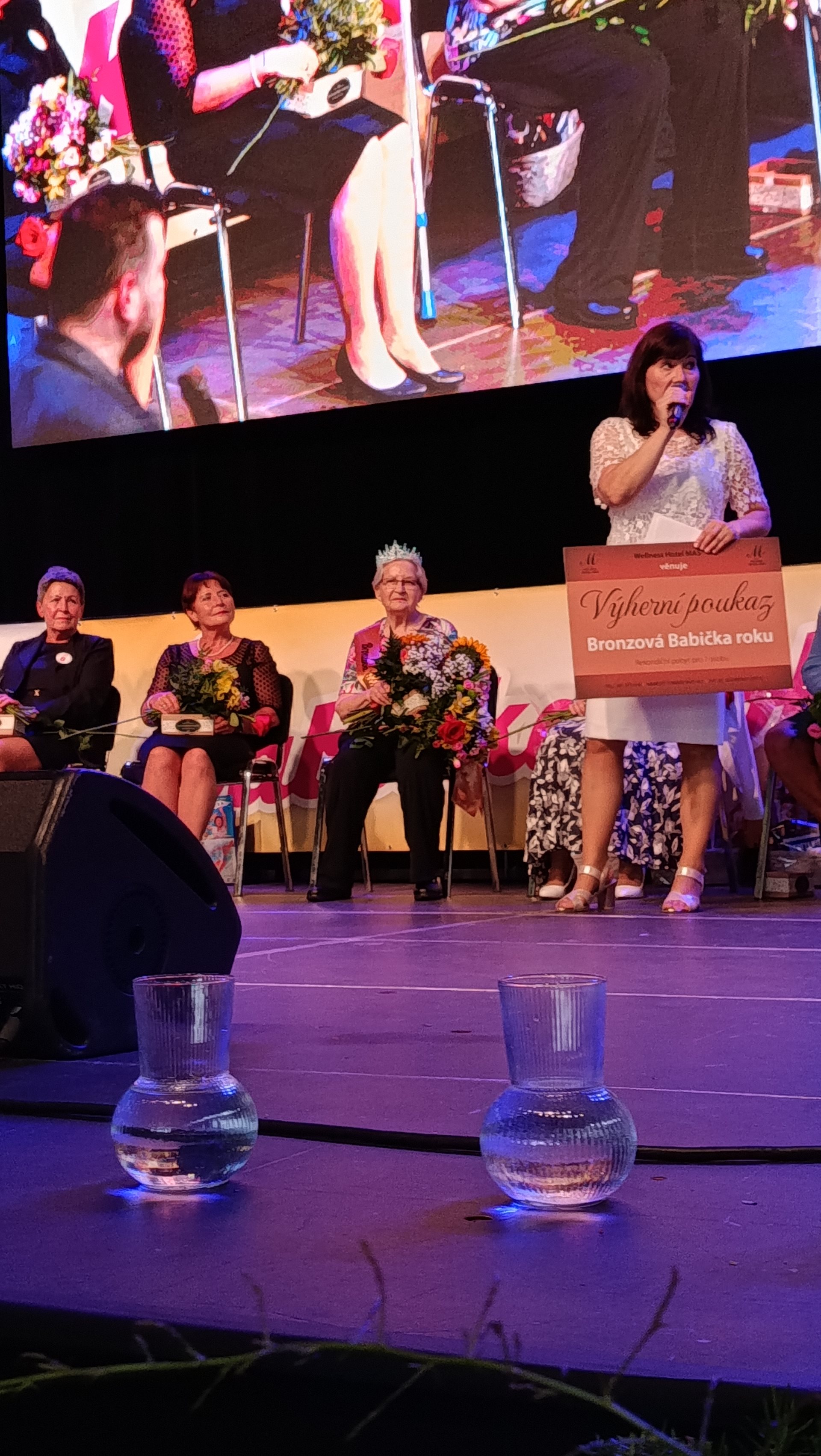 S radostí se chceme podělit o krásnou zprávu. Naše klientka, paní Daniela Miková, se minulý týden zúčastnila krajského kola soutěže Babička roku 2025, kde ve svých úžasných 88 letech získala skvělé 3. místo! 🥉💐
