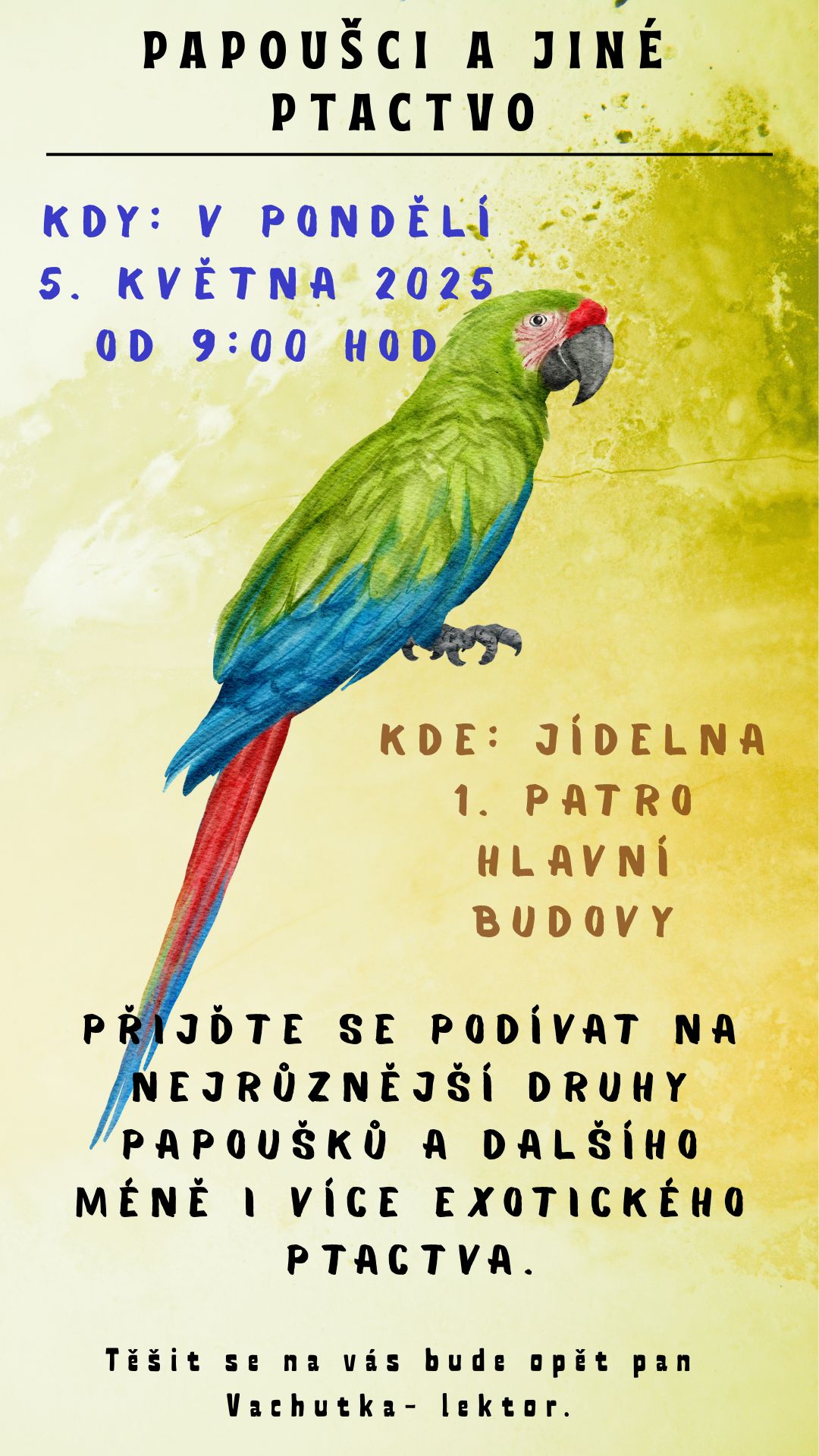 Klienti se dozví nové zajímavosti o exotických i domácích druzích papoušků. Lektor přiveze desítky živých exemplářů a zpříjemní tak klientům celé dopoledne.
