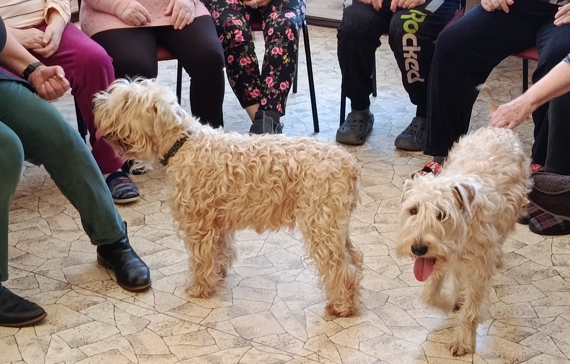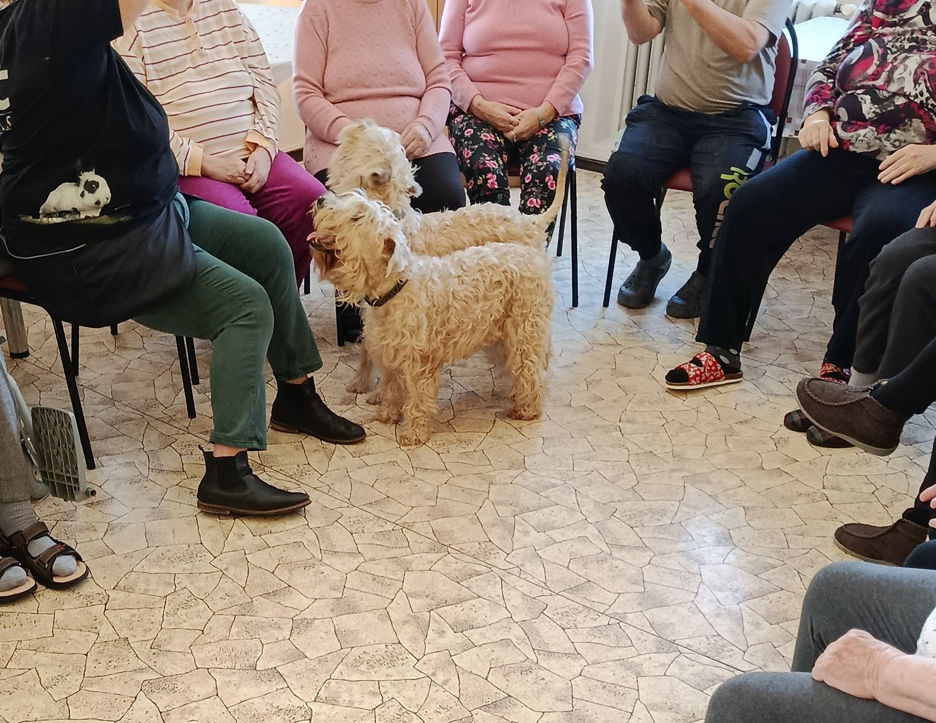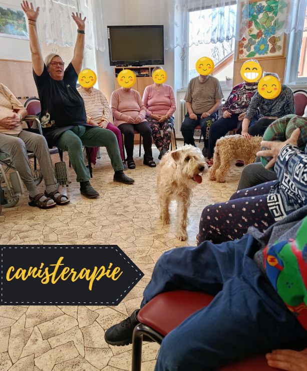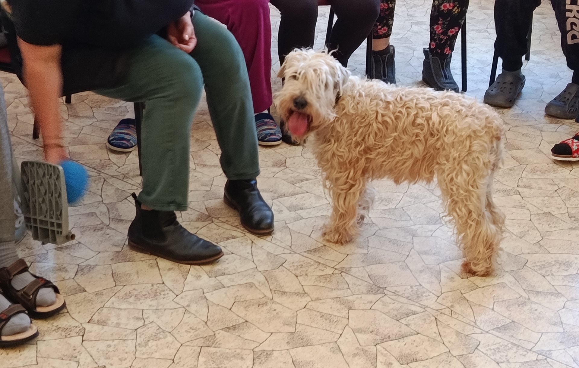 V dubnu proběhla další canisterapie. Klienty navštívili pejsci Kubík s Aničkou, se kterými si užili spoustu zábavy. Klienti vytvořili pejskům tunel ze svých nohou, mohli si vyzkoušet krmení ze lžičky, házení míčku a další aktivity.