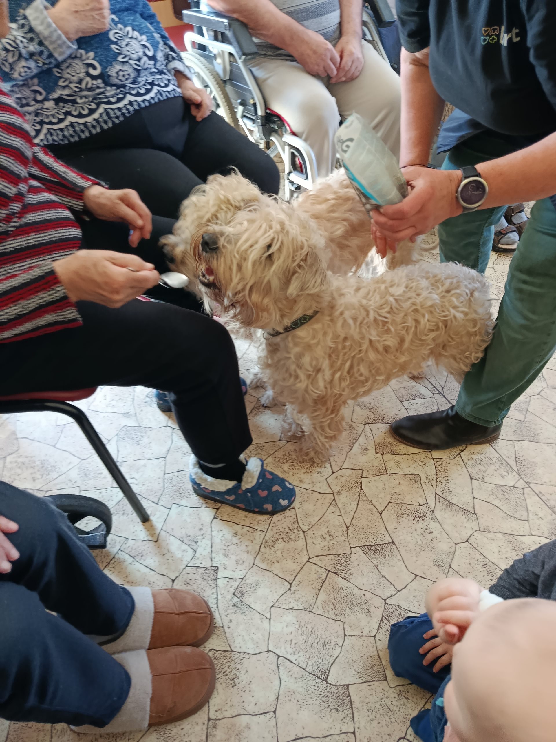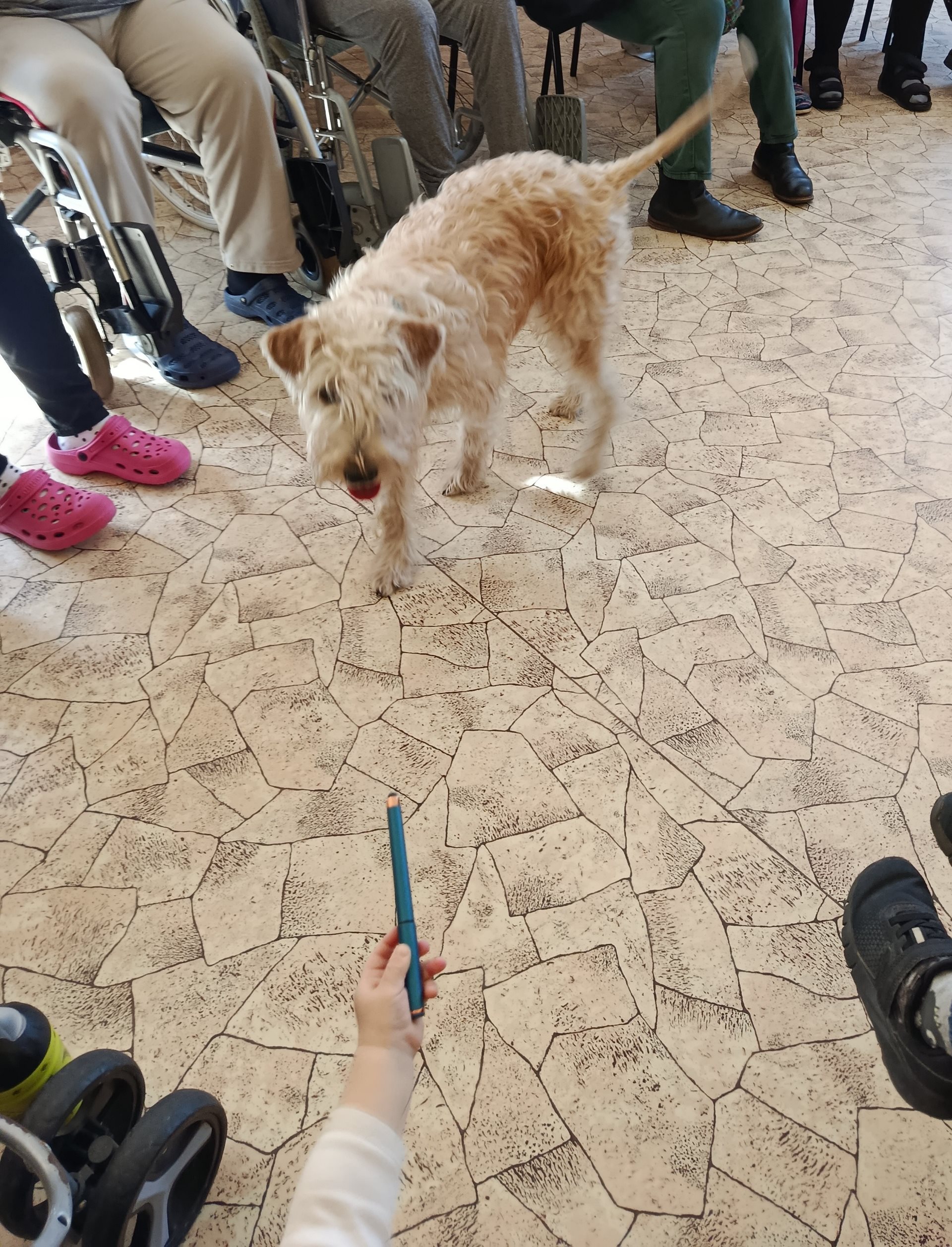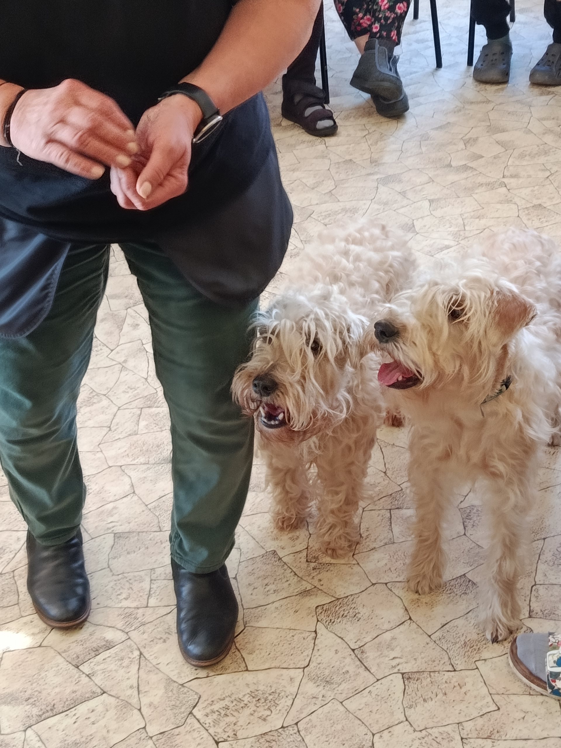 V dubnu proběhla další canisterapie. Klienty navštívili pejsci Kubík s Aničkou, se kterými si užili spoustu zábavy. Klienti vytvořili pejskům tunel ze svých nohou, mohli si vyzkoušet krmení ze lžičky, házení míčku a další aktivity.