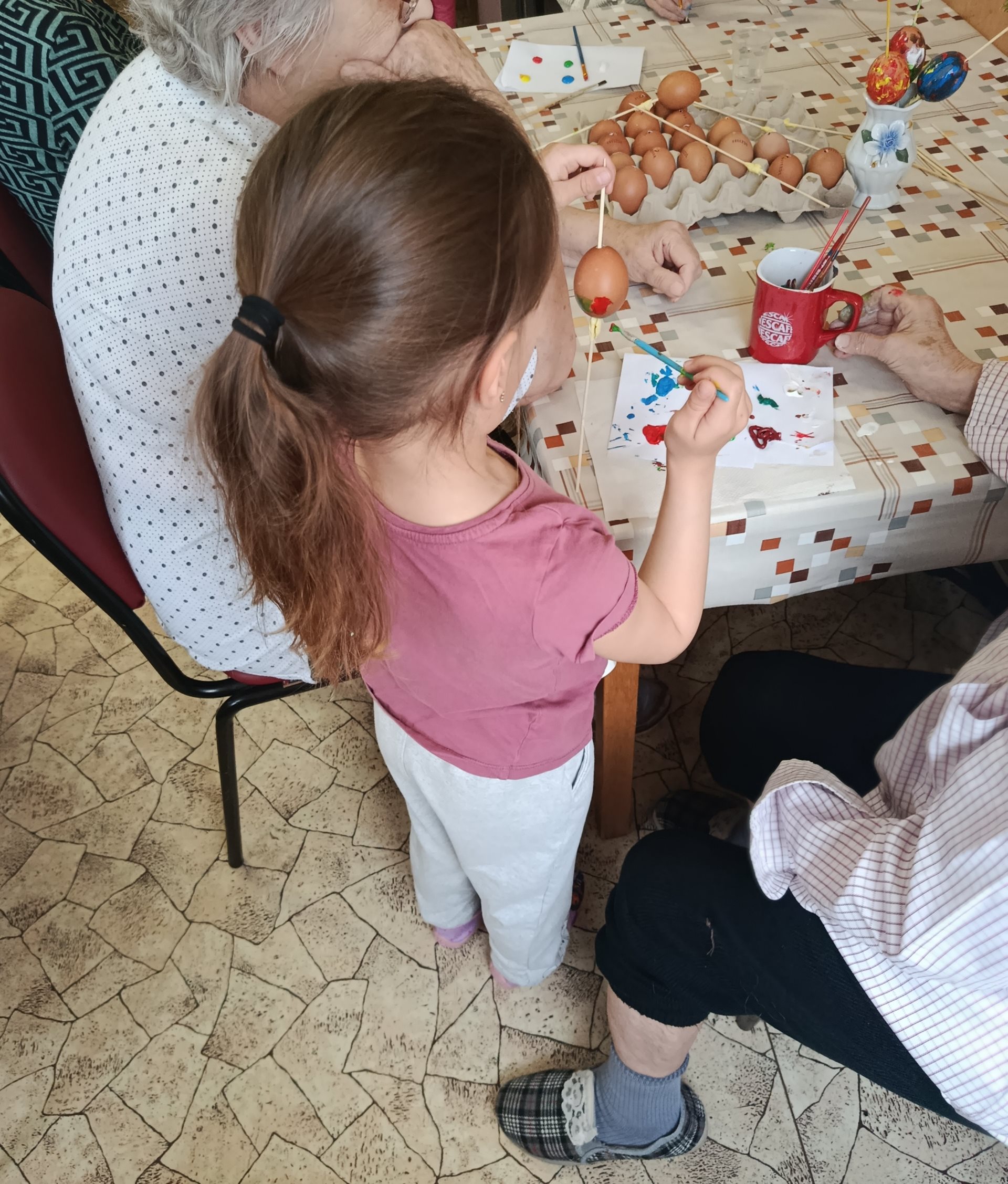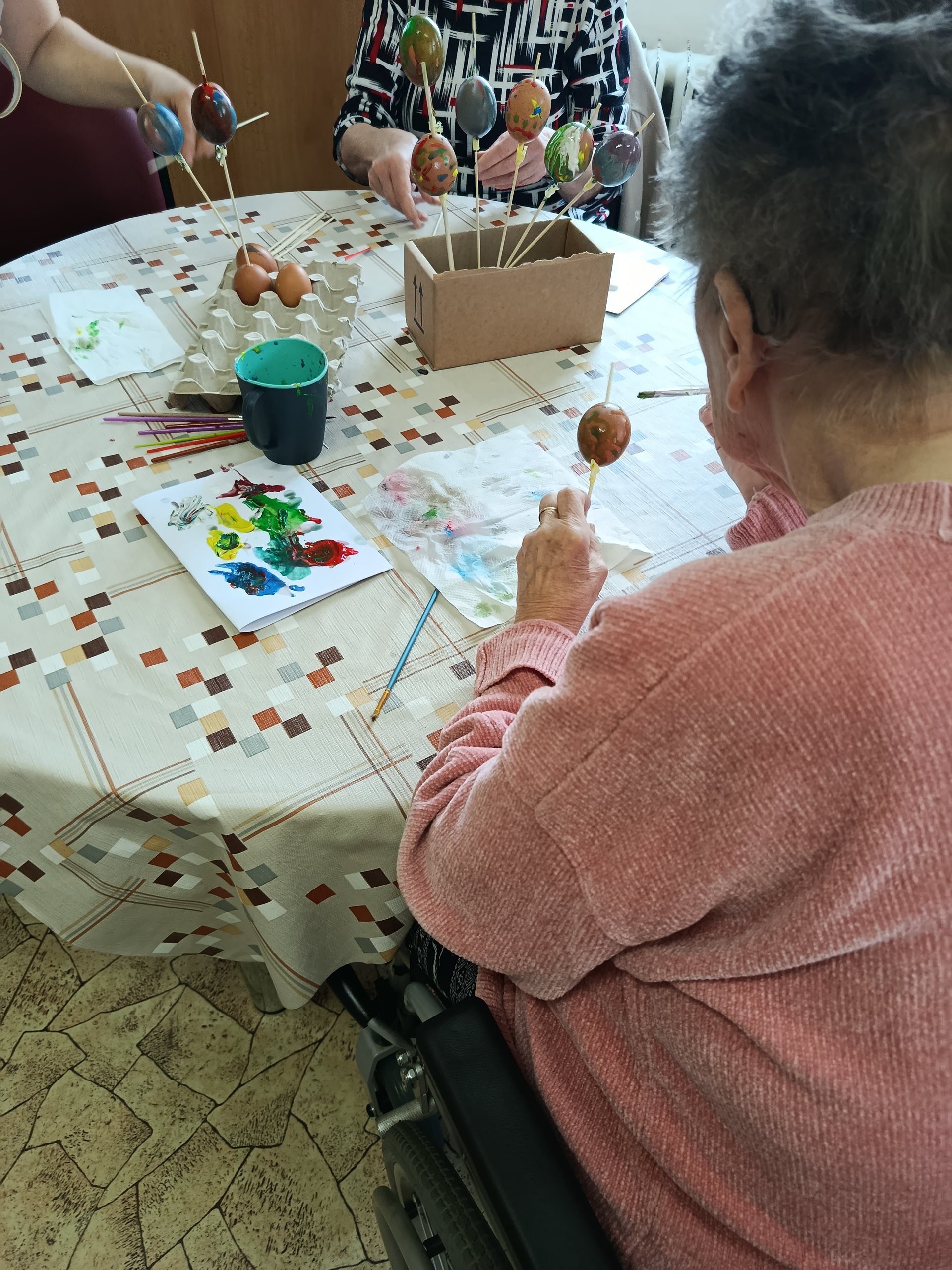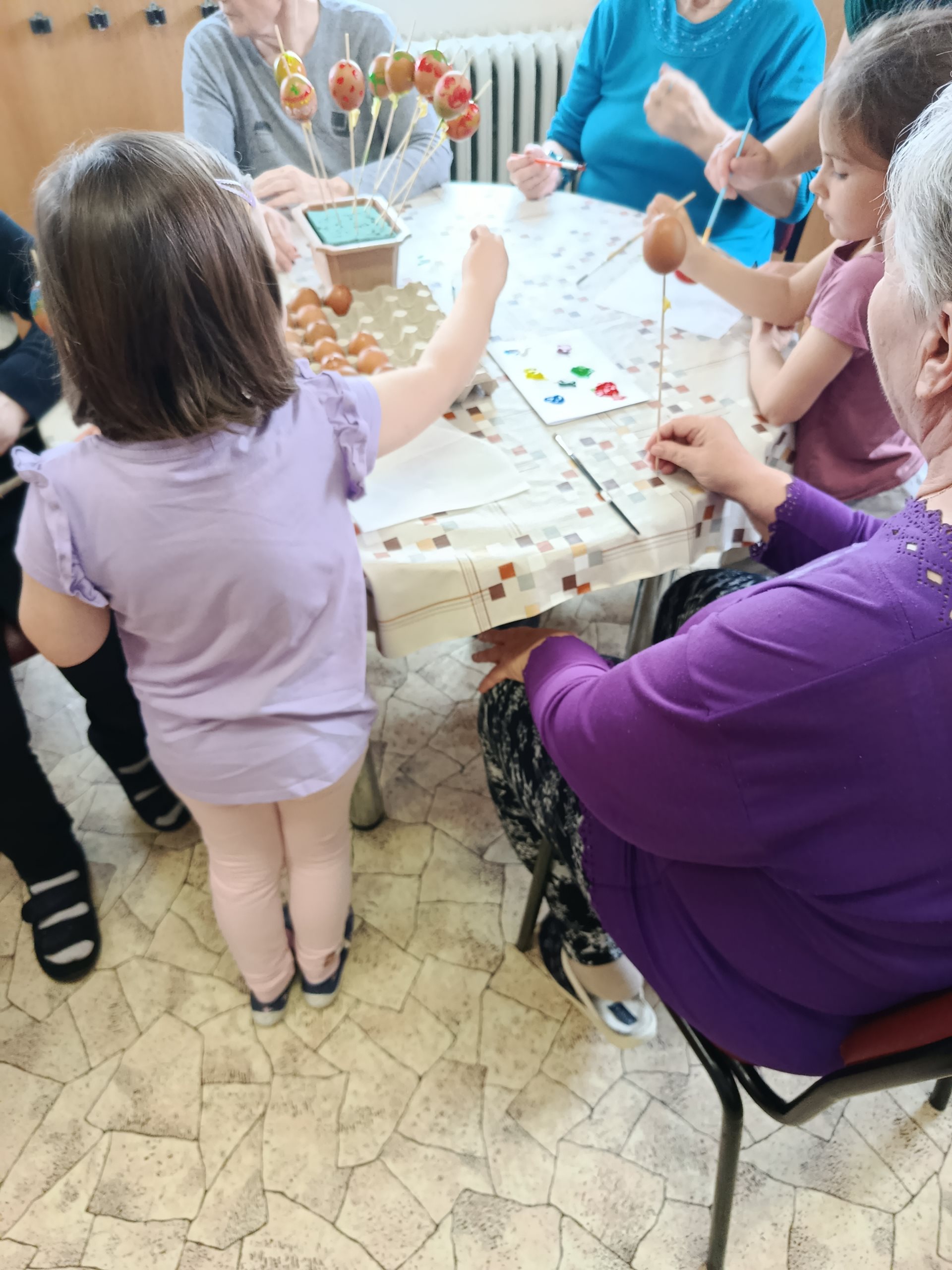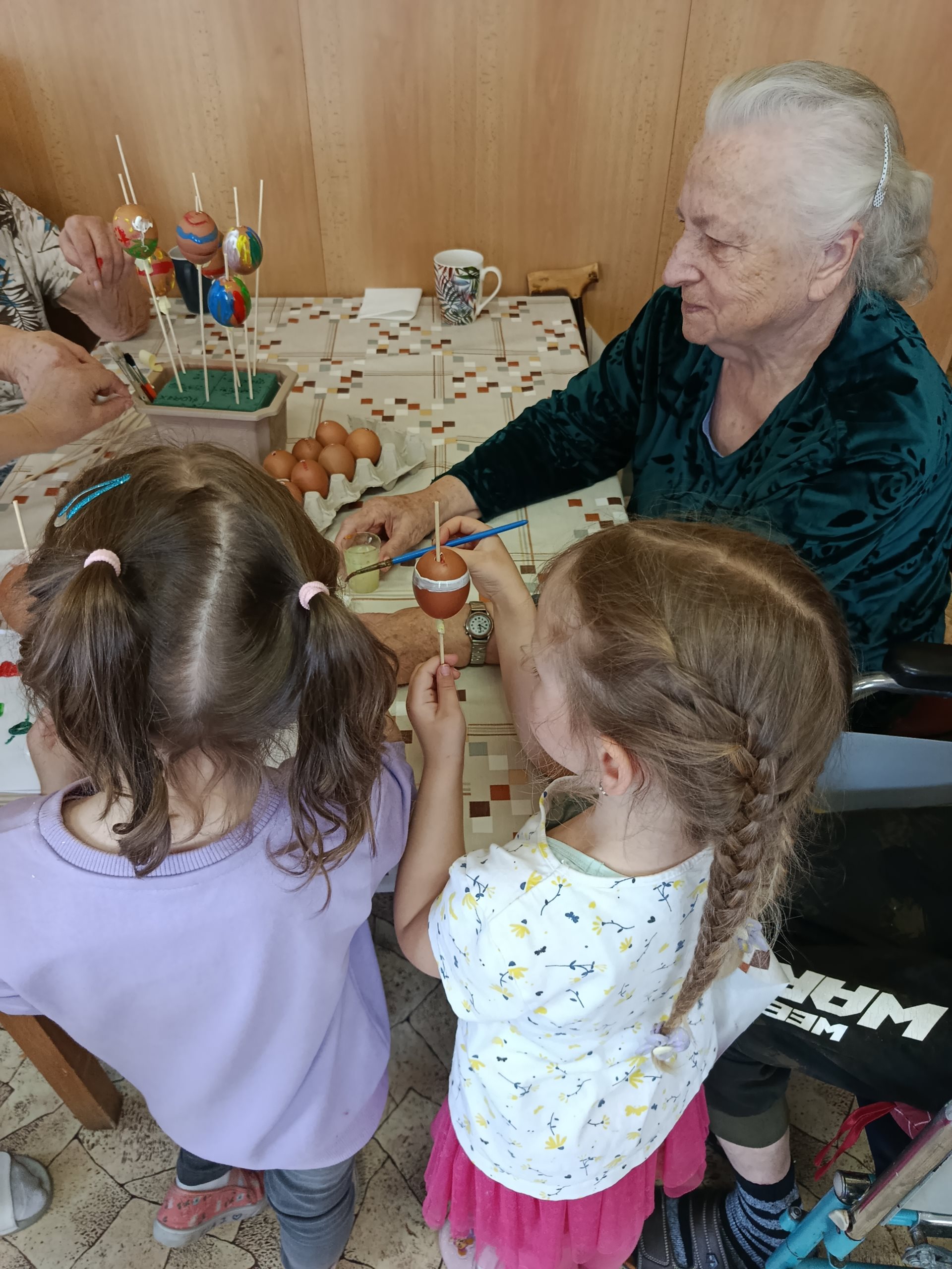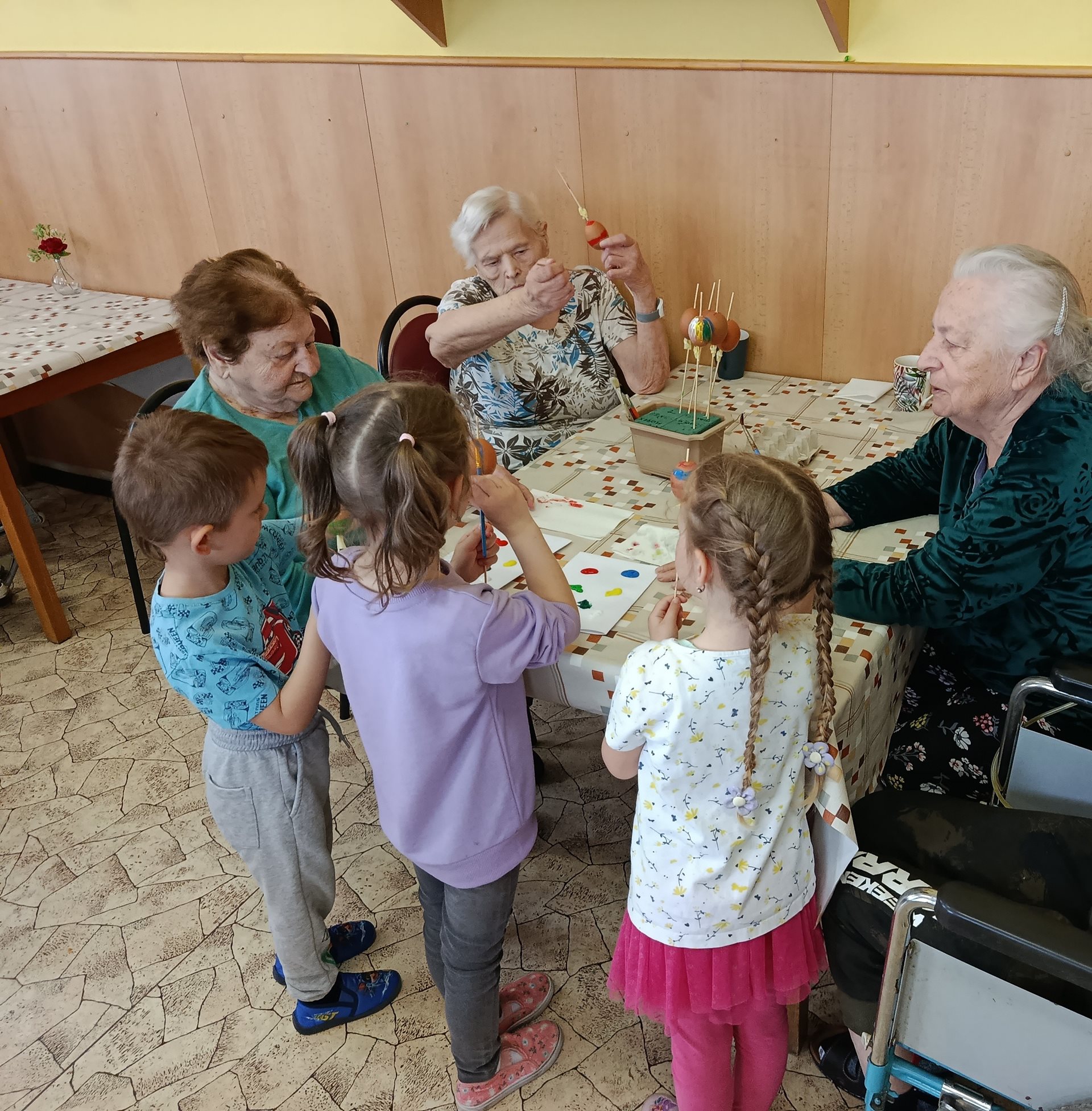 V dubnu navštívily seniory také děti z mateřské školy z Libiny a společně si vytvořili velikonoční výzdobu v podobě malovaných vajíček.